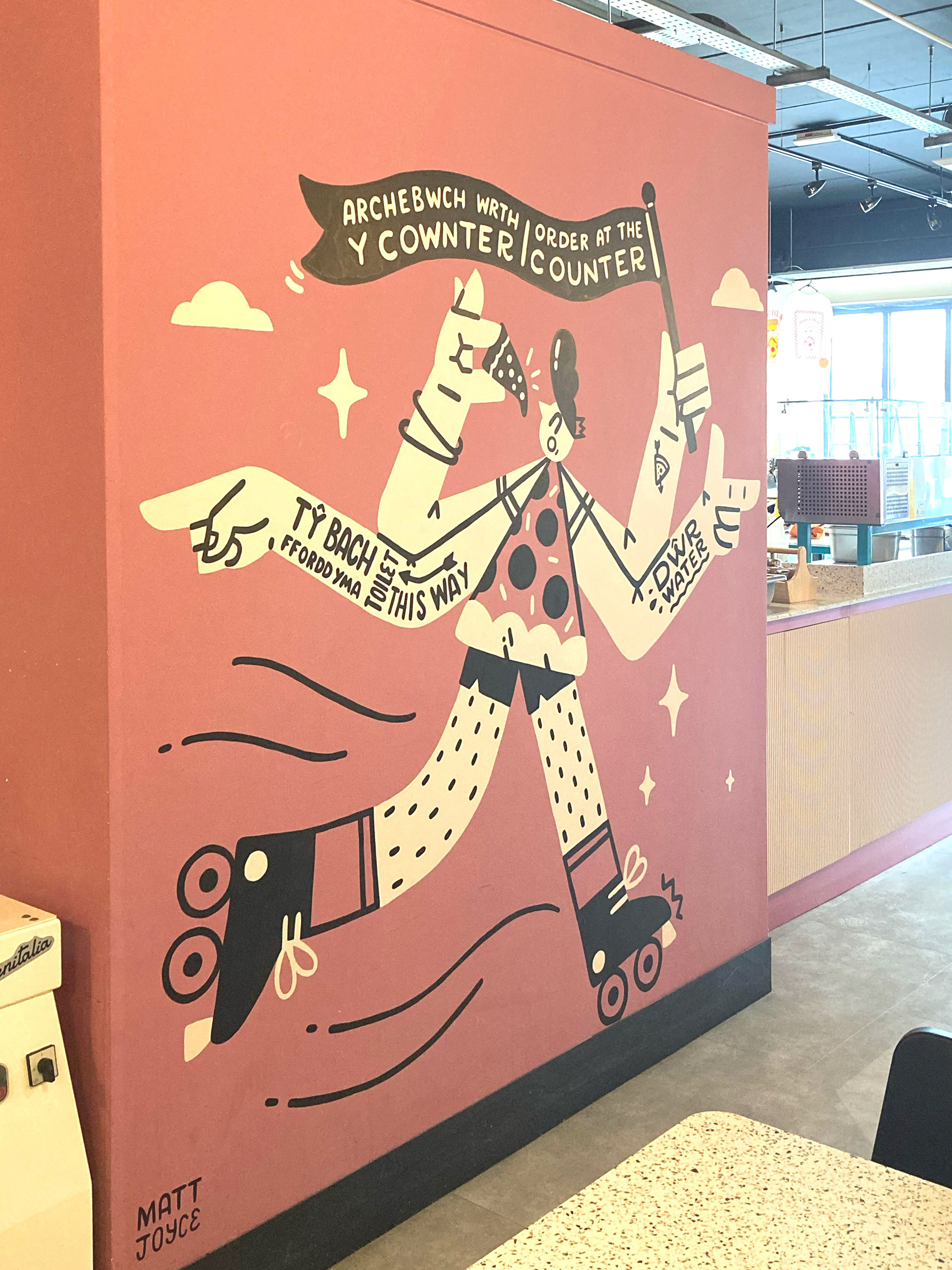 Adding some character to the walls at West Pizza. Channeling some vintage character mascots, especially ones where the mascot is made of and eats the product, and then adding roller skates.